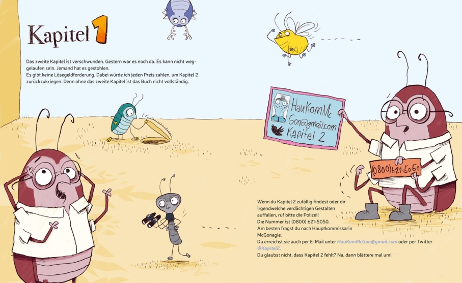 Der Ich-Erzähler dieses Bilderbuchkrimis – in der deutschen Ausgabe als Brille tragende Ameise dargestellt – ist komplett aus dem Häuschen: Das zweite Kapitel wurde gestohlen und sein Buch ist somit nicht mehr vollständig. Und tatsächlich folgt das dritte Kapitel direkt auf die Doppelseite mit dem ersten Kapitel. Hauptkommissarin McGonagle, eine mit Lupe und Pistole ausgestattete, nicht besonders kompetente Eidechsendame, muss helfen, aber auch die Leser*innen werden eingespannt: "Wenn du Kapitel 2 zufällig findest oder dir irgendwelche verdächtigen Gestalten auffallen, ruf bitte die Polizei!“ (Lieb 2023, o.S.) Spätestens in Kapitel 5 wird aufmerksamen Rezipient*innen klar, wo sich das zweite Kapitel befindet und wer der Übeltäter ist. Sie haben dadurch einen Wissensvorsprung gegenüber den Protagonist*innen, die das nicht so leicht begreifen. Zwischendurch gibt es einen kurzen Abstecher in ein Science-Fiction-Abenteuer, das zwischen Kapitel 7 und 8 liegend mit "Kapitel 45“ überschrieben ist und somit innerhalb der Kapitelreihenfolge Verwirrung stiftet, bevor in Kapitel 9, 10 und 11 textlos als enge Bildfolge weitererzählt wird. Unter Einsatz von Spiegelschrift (innerhalb des gestohlenen Kapitels), fehlenden Buchstaben und geraubten Satzzeichen, die allesamt der verdächtig wirkende Hausmeister weggefegt und entwendet hat, ergeben sich einige lustige Missverständnisse. Und auf Kapitel 16 folgt dann tatsächlich Kapitel 2.