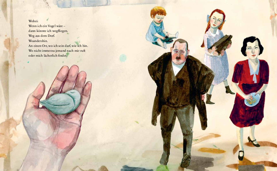 Der Vogel in mir fliegt, wohin er will illustriert die Kindheit und Jugend der Künstlerin Berta Hannson, die im Anschluss an die poetisch gestaltete Erzählung im Rahmen einer kindgerechten biografischen Skizze mitsamt Fotos und Einordnungen zeitgenössischer Ereignisse vorgestellt wird. Das Buch wird durch in kräftigen Farbtönen gehaltene Ölbilder ergänzt, die eine Hommage an das Werk der Künstlerin sind. Teilweise finden sich doppelseitige Illustrationen, die ganz ohne Text auskommen und Lesenden aller Altersstufen die Möglichkeit bieten, in die Farbenwelt der Malerin einzutauchen. Die Leser*innen begleiten die kindliche Protagonistin Berta in eine bäuerliche Welt, in der sie nützlich zu sein hat und in der für Kunst kein Platz ist. Das titelgebende Motiv des davonfliegenden Vogels ist präsent und wird von Berta aufgegriffen, die sich wünscht, sie selbst sei ein Vogel, denn „dann könnte ich wegfliegen“ (S. 12; vgl. Abb. 1).