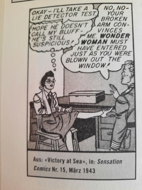 Das reichhaltige Bild-Material dazu kommt je wie ein Panel gerahmt daher, welcher Vorlage es auch entstammen mag (Fotos, Illustrationen, Comics – mit einer Vierfarb-Strecke in der Mitte des dicken Bandes nach S. 276). Mehr als die Hälfte des Textes ist dem Vorlauf zum Entstehen des Comic gewidmet (Teile 1+2 „Veritas“ und „Familienkreis“), um so zu erklären, wie es überhaupt zu einer solch starken Superheldin-Figur kommen konnte (Teil 3 „Paradiesinsel“ und Epilog „Große Hera! Ich bin wieder da!“). Wobei sie letztlich dennoch ein sehr eigenes Frauenbild entwickelt: Feministisch im Auftreten (vgl. Abb. 2), doch „dem Manne untertan“ in subtilen Botschaften. Irgendwie sehr passend zum Leben ihres ‚Erfinders‘, der zeitweise gleich mit drei Frauen zusammenlebte und mit zweien von ihnen Kinder hatte: Eine Patchwork-Familie der etwas anderen Art! Die Geschichte der (Superhelden-)Comics in den USA hat die Autorin gleich mitgeschrieben (Wonder Woman ist beim Verlag DC erschienen, ursprünglich „Detective Comics“), mit vielerlei ergänzenden Details zur Hexenjagd auf Comics dort ab 1954 (CCA = Comics Code Authority). Weit über 400 höchst lesenswerte Inhalts-Seiten für alle, die mit Comics zu tun haben.