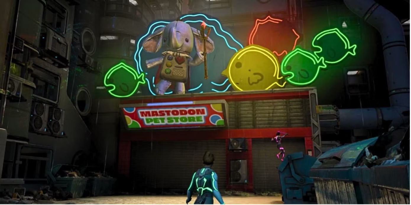 Ein ganz besonderer Reiz liegt in der liebevollen Ausgestaltung der Spielwelt mit einer Vielzahl an gut platzierten Eastereggs und popkulturellen Anspielungen, die sich nie auf bloße Referenzen beschränken, sondern stets spielerisch eingebunden sind. Gleich zu Beginn wartet das Spiel mit einer humorvollen Assassin’s Creed-Hommage auf: der ikonische Heuballensprung wird hier nicht nur nachgestellt, sondern auch augenzwinkernd kommentiert. Es folgt ein Rennen auf Motorrädern, die überraschende Ähnlichkeit mit den ‚Lichtrennern‘ des Tron-Franchises aufweisen. Auch Hazelights eigene Spielvergangenheit bleibt nicht ausgespart: Der berüchtigte Plüschelefant „Cutie“ aus It Takes Two erhält im Sci-Fi-Level ein überraschendes Comeback (Abb. 3).