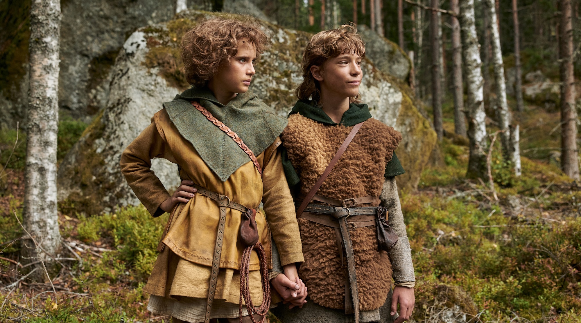 Abb.1: Zwischen Ronja (Kerstin Linden, links) und Birk (Jack Bergenholtz Henriksson, rechts) bahnt sich eine Freundschaft an. Nur im Wald können sie sich von ihren Familien und den Räubern unbemerkt treffen. Pressefoto: 2023 Viaplay Group/Filmlance International AB/Film i Väst/Ahil Films/ARD Degeto Film/Audrius Solominas. Die erste Staffel der Ronja Räubertochter-Serie ist in der ARD Mediathek bis zum 20.12.2025 verfügbar.