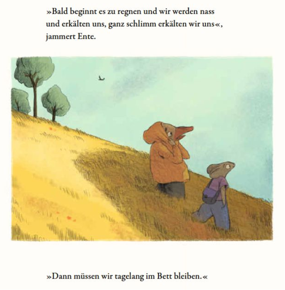 Natürlich frisst schlimmsten- und andernfalls die Angst die Seele auf. Einfach optimistisch zu sein 'auf Rezept', ist indessen kein adäquater Ratschlag. Denn "'Mutmachbücher'", die "Mut […] als Lösung für das Problem der Angst dar[]stell[en]", "erfreuen sich [zwar] in der pädagogischen und didaktischen Praxis großer Beliebtheit. Der gut gemeinte Ansatz, den negativ dargestellten Ängsten positiv dargestellten Mut entgegenzusetzen, kann allerdings bei Rezipient:innen an die Grenzen stoßen, für die Angst keine zu überwindende Schwäche, sondern Teil ihrer Persönlichkeit ist." (Hollerweger 2023) Die gewachsenen Ängste sind in der Regel ja eine Konsequenz aus evolutiven Vorteilen, lebensweltlichen Erfahrungswerten etc.; auch dann, wenn sie dysfunktionale Blüten treiben. Auch diese Perspektive lässt sich aus dem Buch präparieren, was für die Vielschichtigkeit sprechen mag, die eben nicht nur die 'Häuslichkeit' der Ente aufs Korn nimmt, sondern im Umgang der Maus mit ihr die Hilfe zur Selbsthilfe über eine wie auch immer denkbare forcierte Heilung stellt. Obwohl (mutige) Kinder und die meisten Vorlesenden sicherlich Szenen wie diese, in der das "Oh" der Ente auf die Feststellung der Maus, dass sie bereits angekommen sind, ummünzen werden darauf, dass die Ente nur zu ihrem Glück gezwungen werden musste.