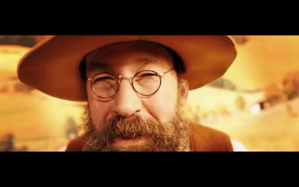 Pettersson kommt nun aus dem Klohäuschen, schaut direkt in die langsam an ihn heranzoomende Kamera und nimmt der Erzählerstimme, die gerade "ein Kater namens..." sagt, das Wort aus dem Mund, den Satz beendend: "Findus." Bereits in dieser Einstellung wird ein im Film wie in den Bilderbüchern wiederkehrender running gag eingesetzt: Findus ist unauffindbar, obwohl Pettersson hektisch nach seinem Freund ruft. Dieser wird nun mit einem filmischen Überraschungseffekt dem Publikum vorgestellt: An einem Ast schwingend, baumelt der Kater in seiner grünen Hose plötzlich direkt vor dem Kameraobjektiv und schaut wie Pettersson kurzzeitig in die Kamera. Durch diese Blicke, die die "vierte Wand" zwischen Zuschauer- und Filmraum durchbrechen, spielt der Film mit Metalepsen (auch in der später folgenden Stier-Sequenz, in der der Stier bei der Verfolgung Findus’ gleichsam aus Versehen das Kameraobjektiv "zerschmettert"; vgl. Abb. 7). Dieses filmstilistische Mittel wird eigentlich vorwiegend im arthouse-Kino eingesetzt.